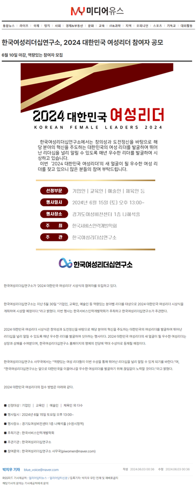 Çѱ¹¿©¼º¸®´õ½Ê¿¬±¸¼Ò´Â Áö³ 5¿ù 30ÀÏ ¡°±â¾÷ÀÎ, ±³À°ÀÎ, ¿¹¼úÀÎ µî ¿ª·®ÀÖ´Â ºÐ¾ßº° ¸®´õ¸¦ ´ë»óÀ¸·Î 2024 ´ëÇѹα¹ ¿©¼º¸®´õ ½Ã»ó½ÄÀ» °³ÃÖÇÏ¿© ½Ã»óÇÒ ¿¹Á¤ÀÌ´Ù.¡±¶ó°í ¹àÇû´Ù. À̹ø Çà»ç´Â Çѱ¹¼ºñ½ºÀη°³¹ßÇÐȸ°¡ ÁÖÃÖÇϰí Çѱ¹¿©¼º¸®´õ½Ê¿¬±¸¼Ò°¡ ÁÖ°üÇÑ´Ù.