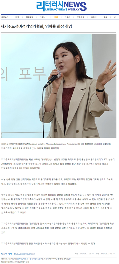 ÀÚ±âÁÖµµÀû¿©¼º±â¾÷°¡Çùȸ(PIWA: Personal Initiative Women Enterpreneur Association)ÀÇ 2´ë ȸÀåÀ¸·Î ¾ÆÀ̵ð¾î »ýȰ¿ëǰ Àü¹®±â¾÷ÀÎ ¼Ö·¹¸¶¸ÁÀ» ¿î¿µÇϰí ÀÖ´Â ÀÓÇÏÀ² ´ëÇ¥°¡ ÃëÀÓÇß´Ù.