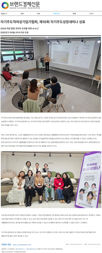 ÀÚ±âÁÖµµÀû¿©¼º±â¾÷°¡Çùȸ(ȸÀå À±ÁöÇý)´Â Áö³ 16ÀÏ °æ±âµµ ¼ö¿ø¿¡ À§Ä¡ÇÑ °æ±âµµ¿©¼ººñÀü¼¾ÅÍ 2Ãþ ºñÀü·ë¿¡¼ ¡®Á¦10ȸ ÀÚ±âÁÖµµ¼ºÀå¼¼¹Ì³ª¡¯¸¦ ¼º·áÇß´Ù°í ¹àÇû´Ù. ÀÚ±âÁÖµµ¼ºÀå¼¼¹Ì³ª´Â ÀÚ±âÁÖµµÀû¿©¼º±â¾÷°¡Çùȸ°¡ 2023³âºÎÅÍ ¿î¿µÇϰí ÀÖ´Â ÇÁ·Î±×·¥À¸·Î ¿©¼º±â¾÷°¡ÀÇ ¼ºÀå°ú ¹ßÀüÀ» À§ÇÑ ÁÖÁ¦¸¦ ´Ù·ç°í ÀÖ´Ù.
