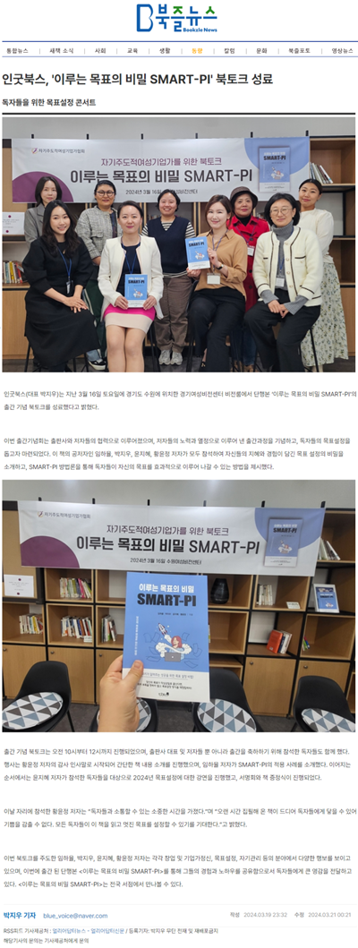 À̹ø ºÏÅäÅ©¸¦ ÁÖµµÇÑ ÀÓÇÏÀ², ¹ÚÁö¿ì, À±ÁöÇý, ȲÀ±Á¤ ÀúÀÚ´Â °¢°¢ â¾÷ ¹× ±â¾÷°¡Á¤½Å, ¸ñÇ¥¼³Á¤, ÀÚ±â°ü¸® µîÀÇ ºÐ¾ß¿¡¼ ´Ù¾çÇÑ Çຸ¸¦ º¸À̰í ÀÖÀ¸¸ç, À̹ø¿¡ Ãâ°£ µÈ ´ÜÇົ <ÀÌ·ç´Â ¸ñÇ¥ÀÇ ºñ¹Ð SMART-PI>¸¦ ÅëÇØ ±×µéÀÇ °æÇè°ú ³ëÇϿ츦 °øÀ¯ÇÔÀ¸·Î¼ µ¶Àڵ鿡°Ô Å« ¿µ°¨À» Àü´ÞÇϰí ÀÖ´Ù. <ÀÌ·ç´Â ¸ñÇ¥ÀÇ ºñ¹Ð SMART-PI>´Â Àü±¹ ¼Á¡¿¡¼ ¸¸³ªº¼ ¼ö ÀÖ´Ù.