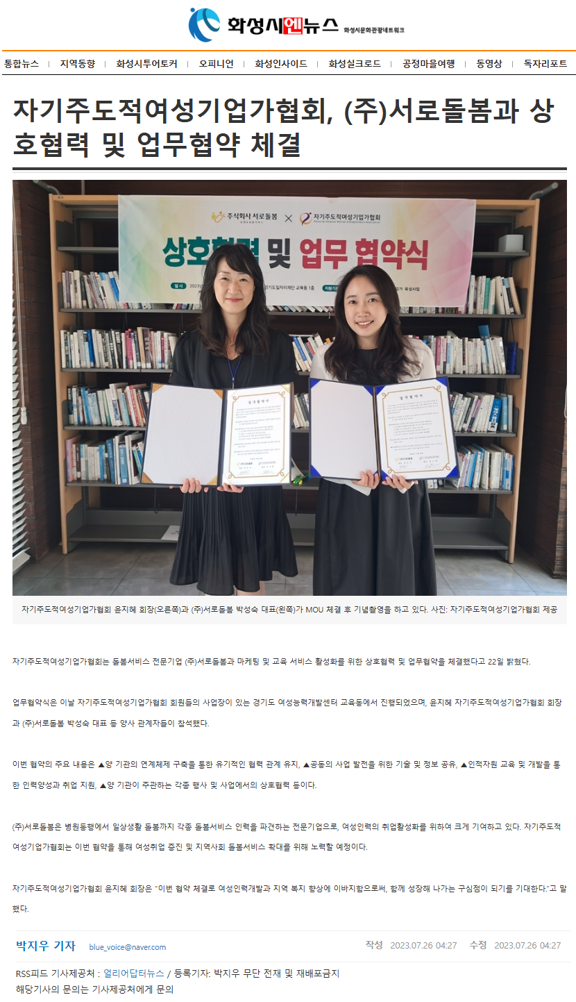 [2023-07-26] ÀÚ±âÁÖµµÀû¿©¼º±â¾÷°¡Çùȸ, (ÁÖ)¼·Îµ¹º½°ú »óÈ£Çù·Â ¹× ¾÷¹«Çù¾à ü°á